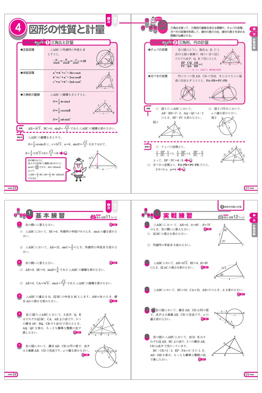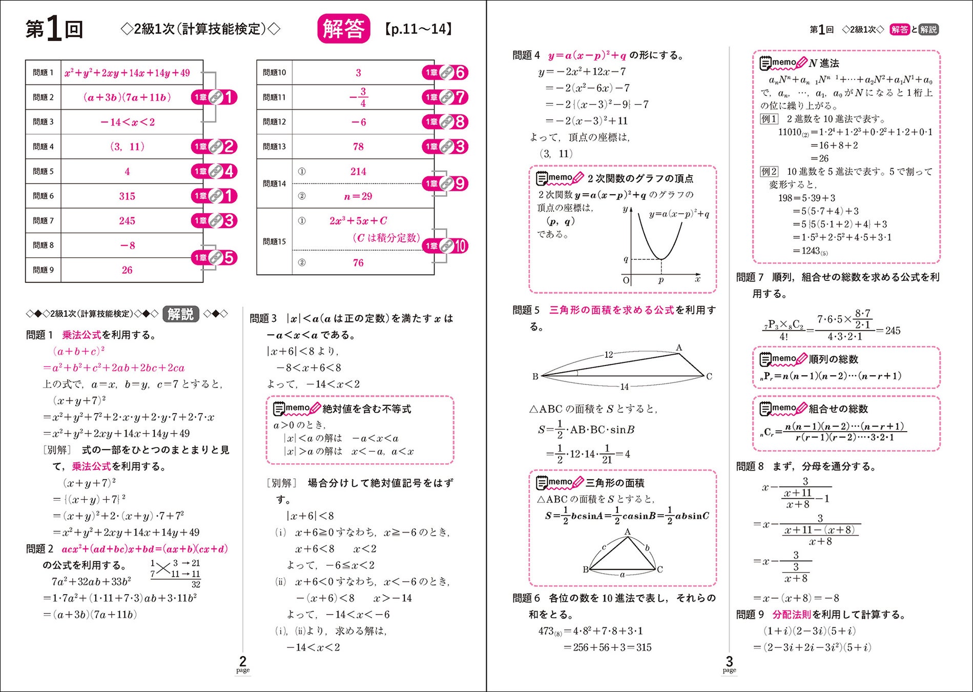 数学検定2級は、主に計算力を測る計算技能検定(1次)と、応用力を測る数理技能検定(2次)に分かれています。同じ単元でも1次と2次で問題傾向が異なるため、それぞれの出題傾向に合わせて演習を行うことが合格へのカギです。本書は前半が1次対策、後半が2次対策の二部構成になっており、それぞれのちがいを意識しながらどちらもしっかりと対策できます。