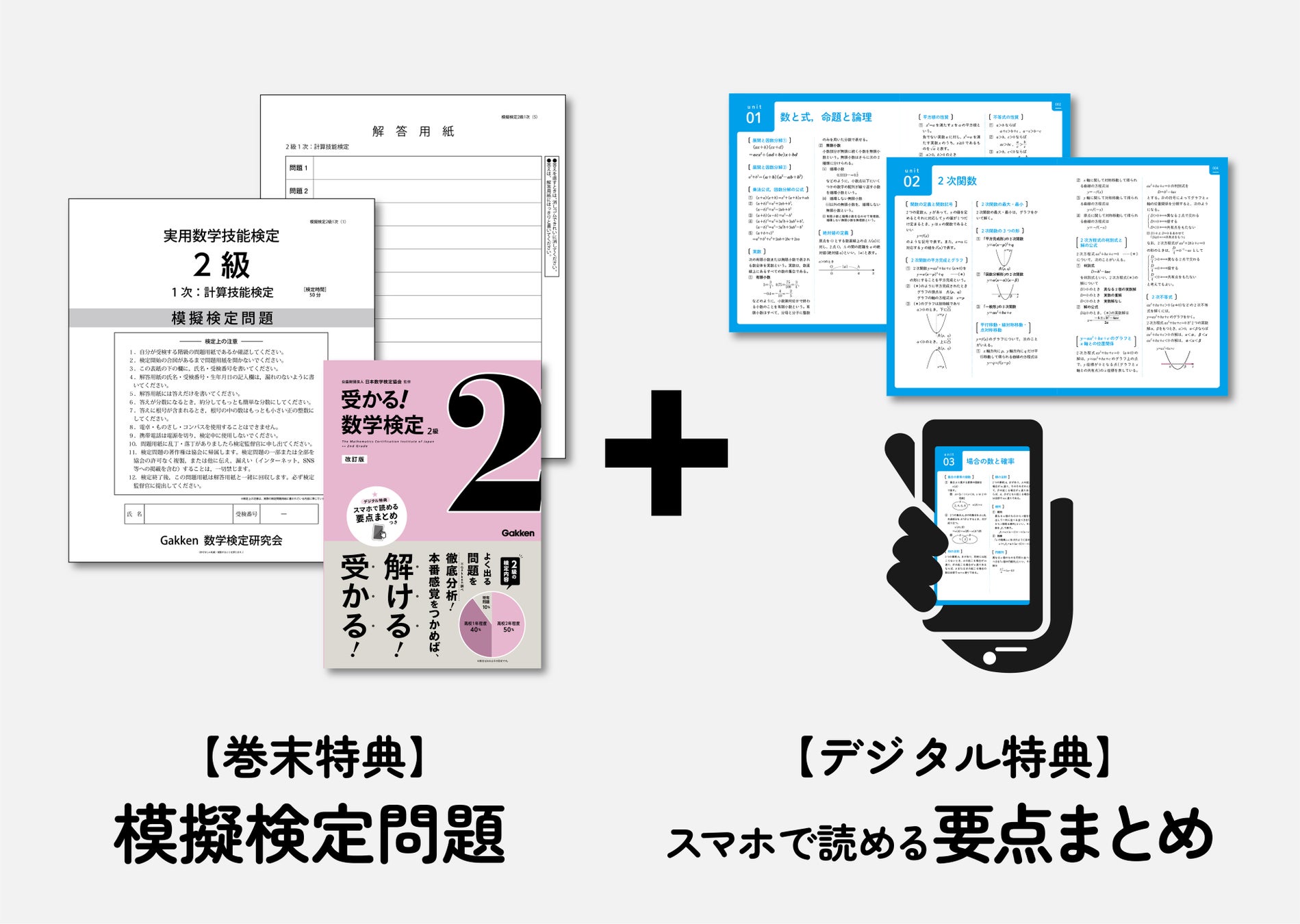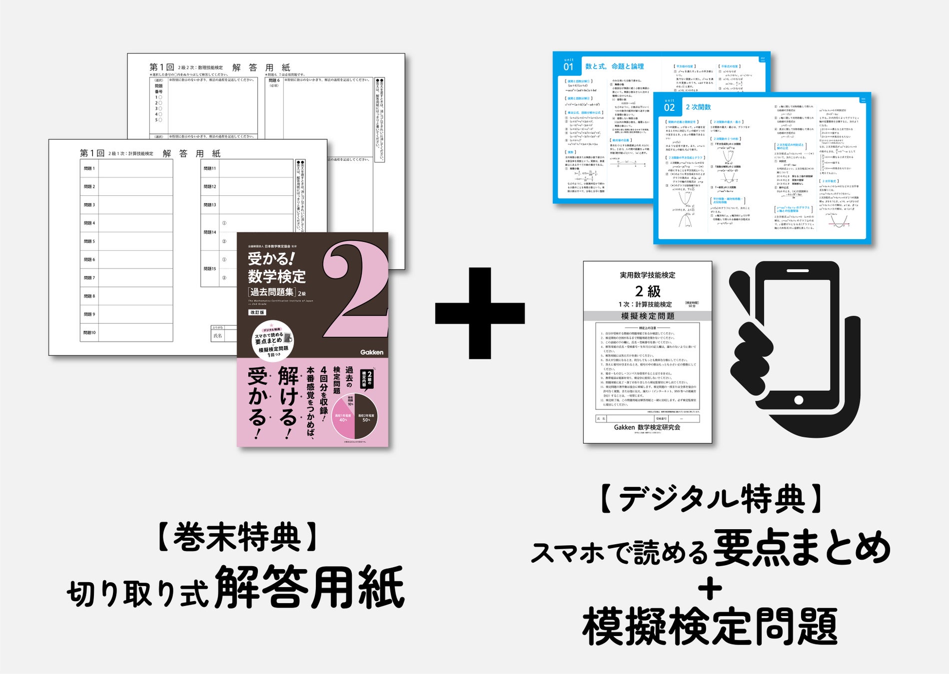 Gakken編集部がよくでる問題を徹底分析『受かる!数学検定 2級』の対策本がリニューアルされました!「模擬検定問題」や「スマホで読める要点まとめ」がついてさらに万全な対策ができるようになりました!