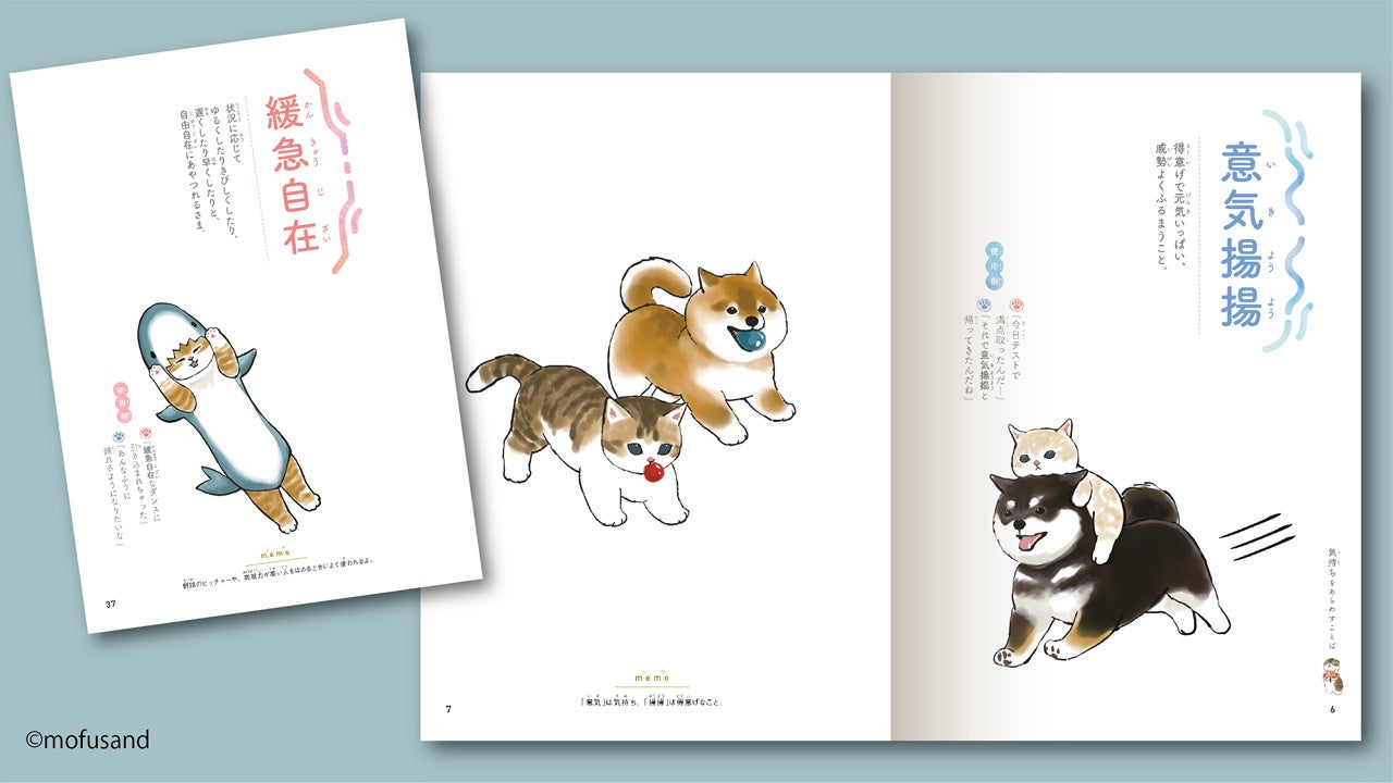 さらに、熟語の「意味」のほか、「使用例」を入れているので、実際に使用する状況をイメージしながら、かわいいmofusandのもふもふにゃんこたちといっしょに、楽しく学ぶことができます。