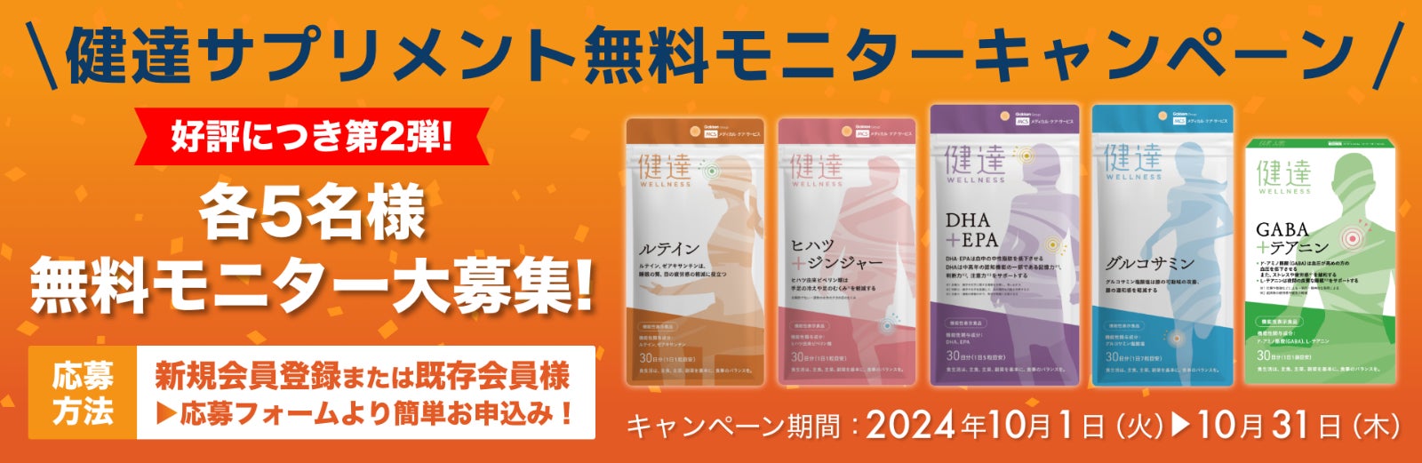 株式会社 学研ホールディングス(東京・品川/代表取締役社長:宮原博昭)のグループ会社、メディカル・ケア・サービス株式会社(埼玉・さいたま市/代表取締役社長:山本教雄)は、2024年10月1日(火)より、家族の介護と健康を支える学研の情報サイト「健達ねっと」にて、健達サプリメント無料モニターキャンペーン第2弾を開始いたしました。