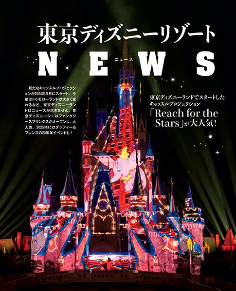 東京ディズニーランドでは2024年9月から新しいナイトタイムエンターテイメント「Reach for the Stars」がスタート。シンデレラ城にディズニー作品が次々とプロジェクションマッピングで表現され、壮大な世界が広がります。東京ディズニーシーの「ファンタジースプリングス」も大人気。見やすい両パークと「ファンタジースプリングス」のMAPもついて、超お得。初めての人も、お久しぶりの人も、パークの予習にぴったりです。パークチケットプレゼント企画も見逃せません。