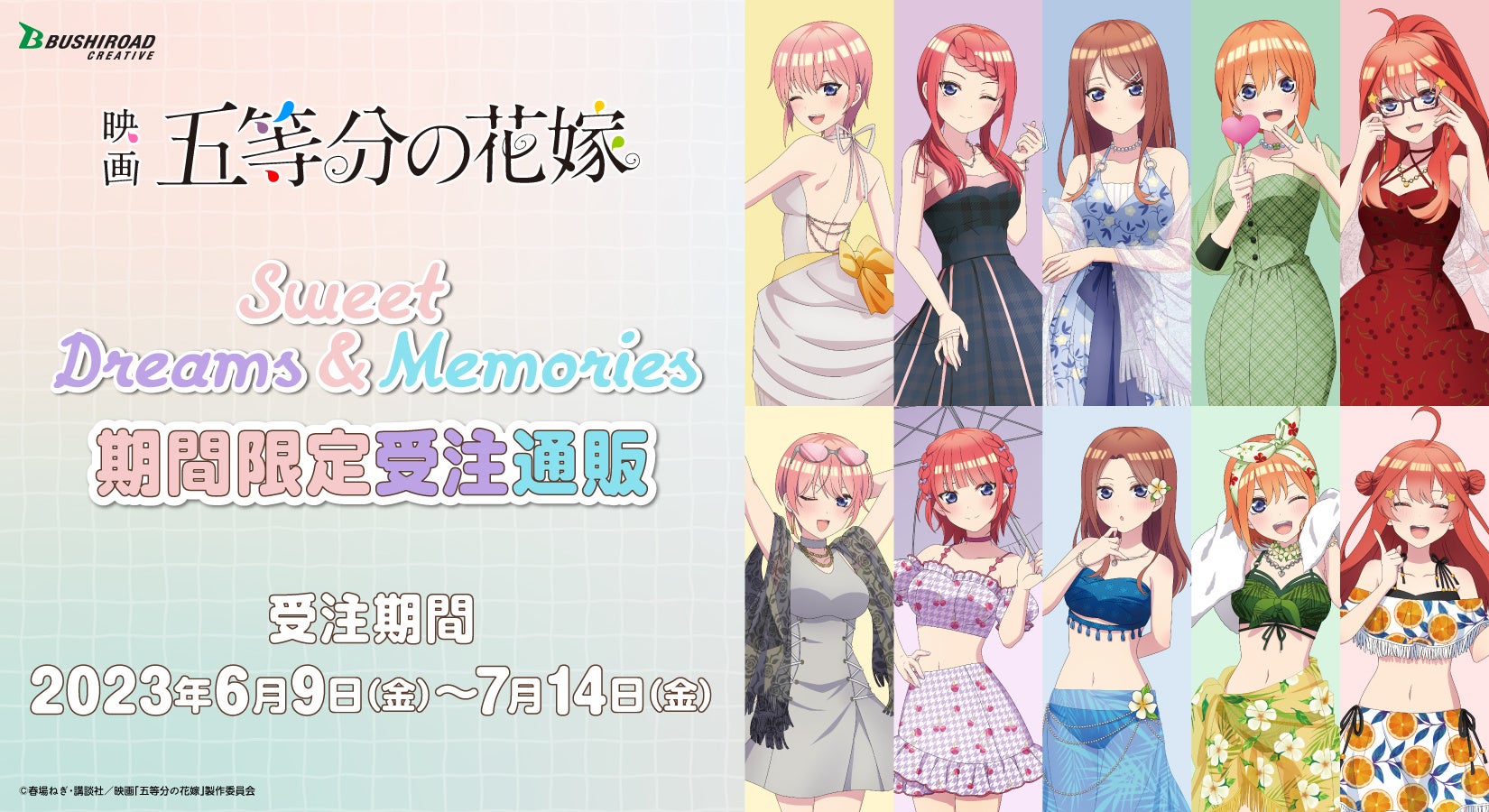 株式会社ブシロード(本社:東京都中野区、代表取締役社長:木谷高明)のグループ会社にあたる株式会社ブシロードクリエイティブ(本社:東京都中野区、代表取締役社⻑:成⽥耕祐)は、2023年6月9日(金)から映画「五等分の花嫁」のコラボカフェ『映画「五等分の花嫁」 ~Sweet Dreams & Memories~』の詳しい情報の公開とブシロード オンラインストアにて行う期間限定受注通販の概要をお知らせいたします。