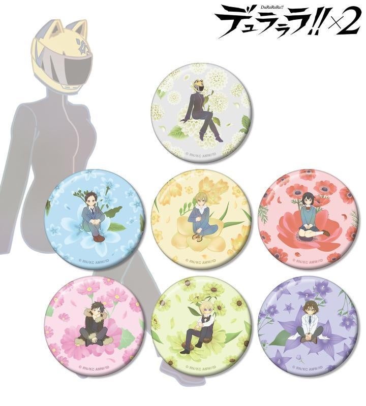セルティ・ストゥルルソン、竜ヶ峰帝人、紀田正臣、園原杏里、折原臨也、平和島静雄、岸谷新羅のイラストをボタニカルデザインに落とし込んで繊細なタッチで新たに描き起こし、缶バッジに仕上げました。