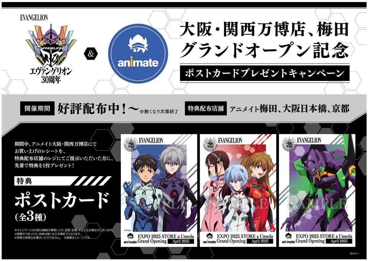 さらに、「アニメイト大阪・関西万博店」グランドオープン記念として、お買い物いただいた方に先着で「エヴァストア20周年記念×アニメイト 缶バッジ」をプレゼント!加えて、「アニメイト大阪・関西万博店」でご購入いただいたレシートを、アニメイト梅田・大阪日本橋・京都にお持ちいただいた方には「ポストカード」もお渡ししておりますので、ぜひチェックしてみてください。