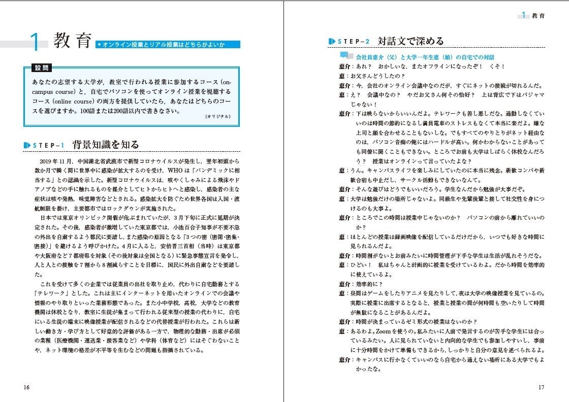 「背景知識を知る→対話で深める→解答を作る」の3ステップ形式で、無理なく英作文が書けるようになります。まずそのトピックについて、現状がどうなっているか、どのような説があるかなどを知り、次にその知識について、先生と生徒、先生同士、生徒たちの対話などで考えを深めます。インプットした背景知識と対話を使って、今度は自分の考えを英作文にしたためます。解答例を見て、自分の解答と見比べてみます。