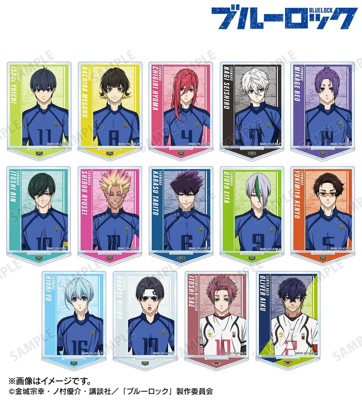 潔 世一、蜂楽 廻、千切 豹馬 、凪 誠士郎、御影 玲王、糸師 凛、士道 龍聖、烏 旅人、乙夜 影汰、雪宮 剣優、氷織 羊、七星 虹郎、糸師 冴、オリヴァ・愛空のイラストをメインにアクリルスタンドに仕上げました。