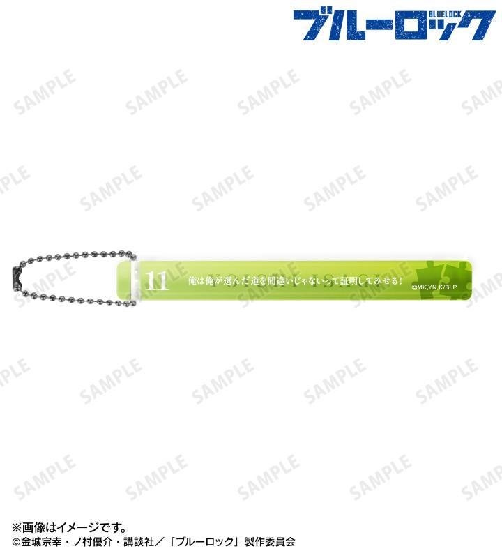 潔 世一、蜂楽 廻、千切 豹馬、凪 誠士郎、御影 玲王、糸師 凛、士道 龍聖、烏 旅人、氷織 羊、糸師 冴、オリヴァ・愛空の名前、台詞、イメージモチーフ、背番号を、昔ながらのホテルのルームキーをイメージしたアクリルキーホルダーに仕上げました。