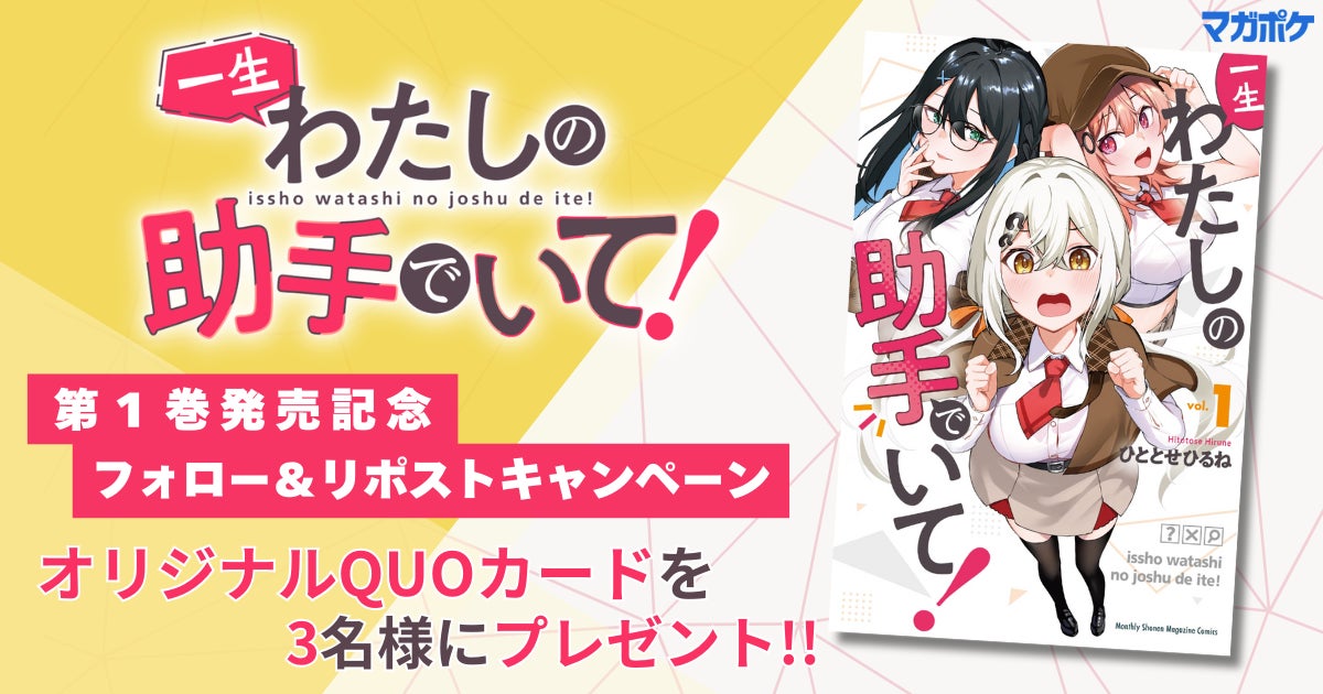 本日0時より、『一生わたしの助手でいて!』第1巻発売記念のキャンペーンをXの作品公式アカウント(@watashinojoshu)にて開催中! オリジナルQUOカードが当たるチャンス。ぜひご応募ください。