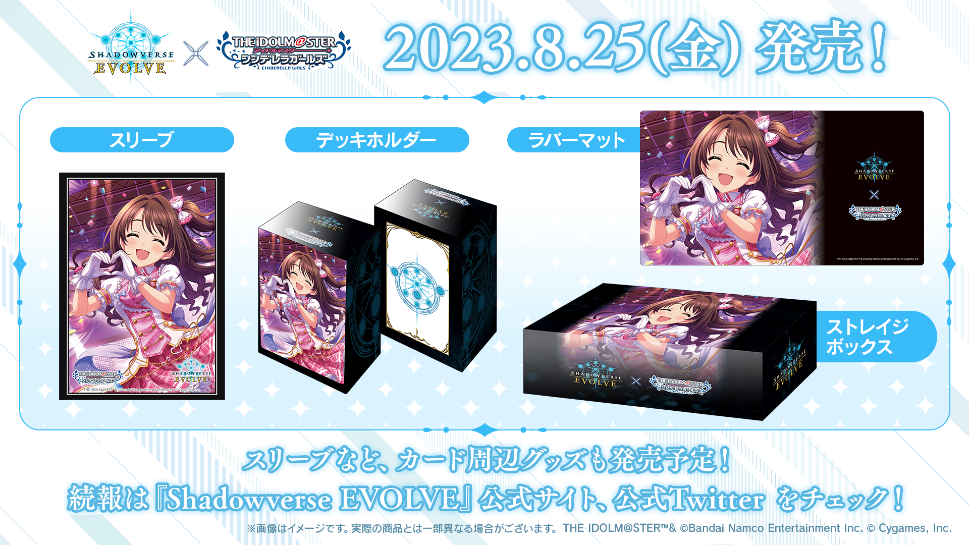 株式会社ブシロード(本社:東京都中野区、代表取締役社長:木谷高明)と株式会社Cygames(本社:東京都渋谷区、代表取締役社長:渡邊耕一)は、『Shadowverse EVOLVE』と『アイドルマスター シンデレラガールズ』とのコラボスターターデッキ3種とコラボパックを2023年8月25日(金)に発売することをご報告いたします。報道関係の皆様におかれましては、ぜひ本情報をお取り扱いいただけますようお願い申し上げます。