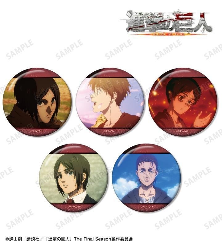 エレン、ミカサ、アルミン、ハンジ、リヴァイの印象的なシーンを缶バッジに仕上げました。