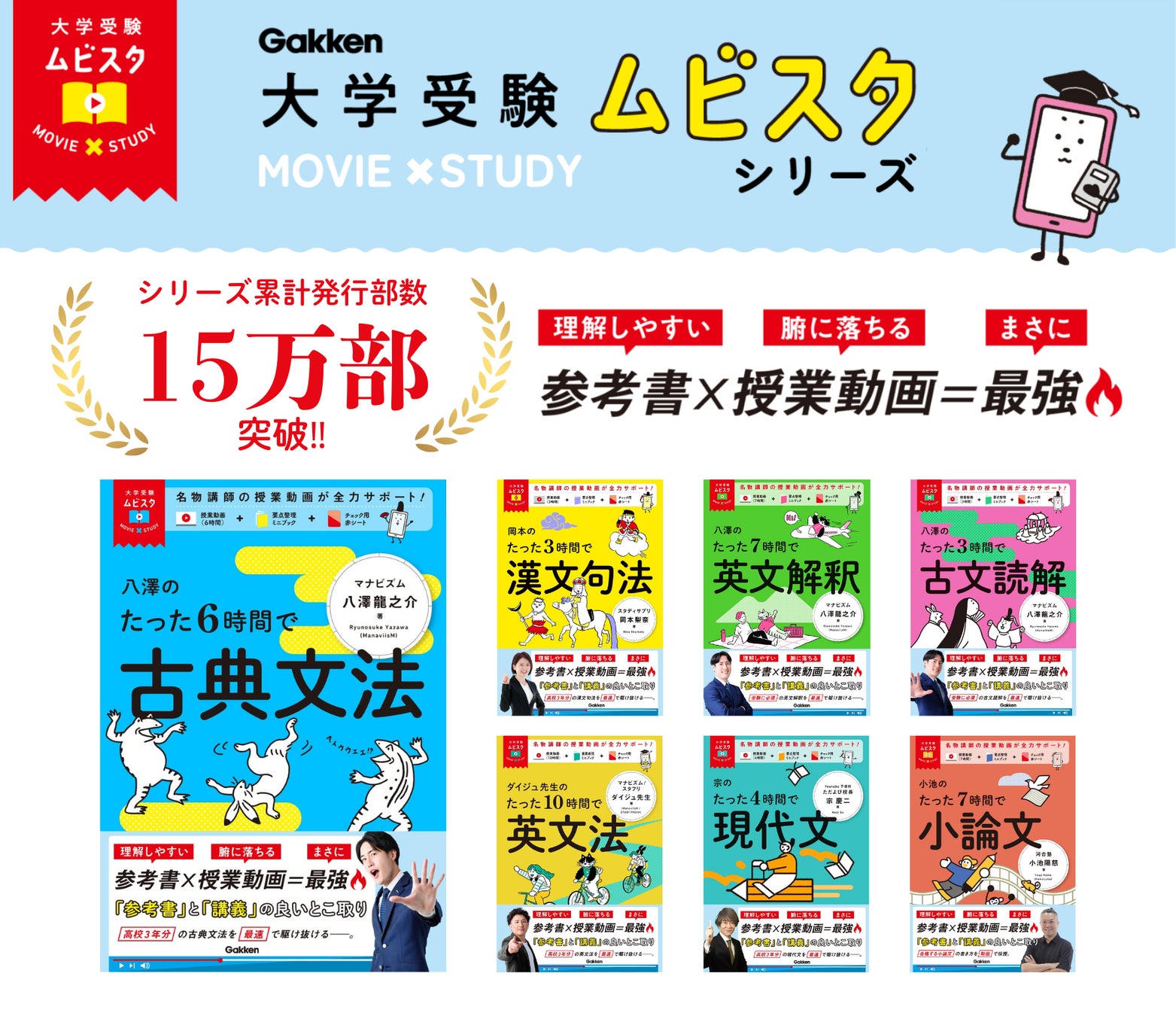 株式会社 学研ホールディングス(東京・品川/代表取締役社長:宮原博昭)のグループ会社、株式会社Gakken(東京・品川/代表取締役社長:南條達也)は、2024年10月4日(金)に『大学受験ムビスタ』シリーズ『岡本のたった3時間で漢文句法』『宗のたった4時間で現代文』『ダイジュ先生の10時間で英文法』『八澤のたった3時間で古文読解』の重版を決定いたしました。これにより『大学受験ムビスタ』シリーズは累計発行部数15万部を突破しました。