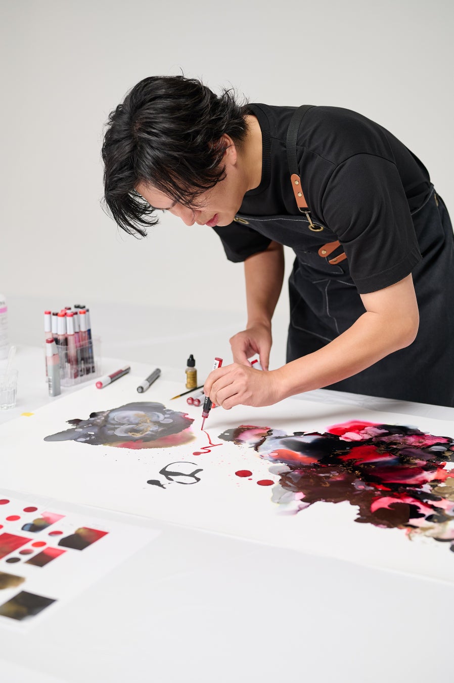 表紙は、能登地域の伝統工芸「輪島塗り」からインスピレーションを受けたアートワークを加藤シゲアキさんが制作。輪島塗の「黒」「赤」「金」が混ざり合う印象的な「絵」は、「アルコールインクアート」という手法によって描かれました。アルコールインクアートとは、アルコールインクを撥水性のある紙にたらし、インクのにじみや広がり、色の混ざりやにじみによって表現するアートです。本アート制作の経験がある加藤さんからの提案で実現したもので、一般社団法人日本アルコールインクアート協会、代表理事の鈴木美香さんにご協力をいただきました。
