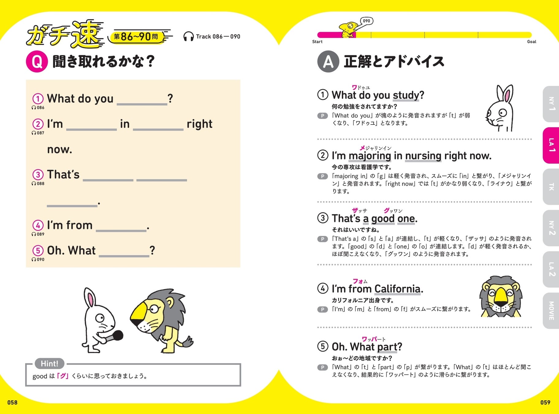 本書は、英語圏の赤ちゃんが子どもの頃から触れている「ガチ速」の世界を日本にいながら体感できるよう構成しています。より短時間で、より少ない学習量でリスニング力(=ネイティブと英会話する力)を高められるよう、リアルな英会話を楽しみましょう。