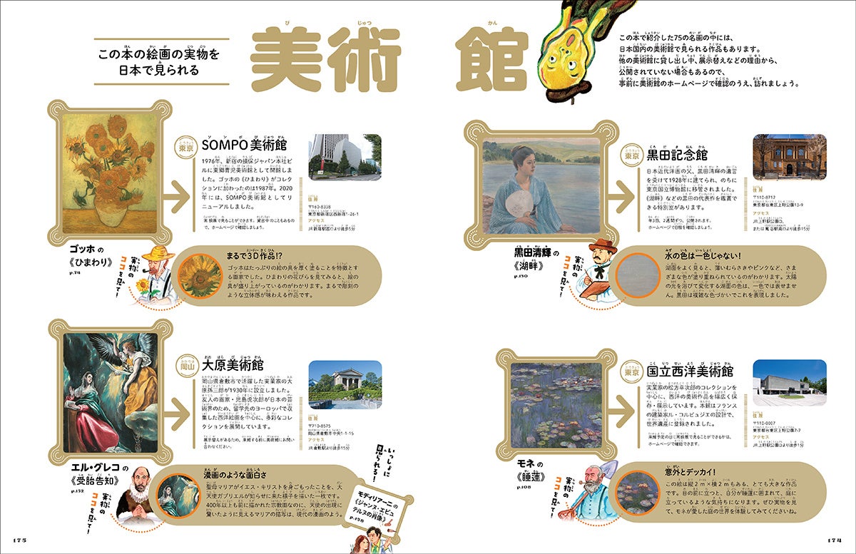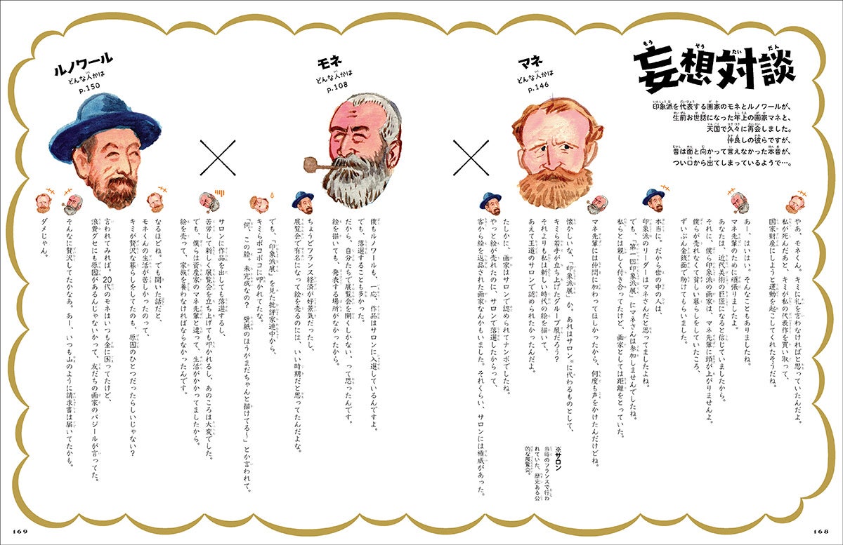 印象派の巨匠、マネ、モネ、ルノワールが天国で集まったら、どんな話をするのでしょうか。大画家たちによる対談を妄想でつづったコラムを各章末に掲載しています。巻末には、西洋・日本美術の流行がわかる年表や、この本に登場する絵画の実物を国内で見られる美術館ガイドもついています。