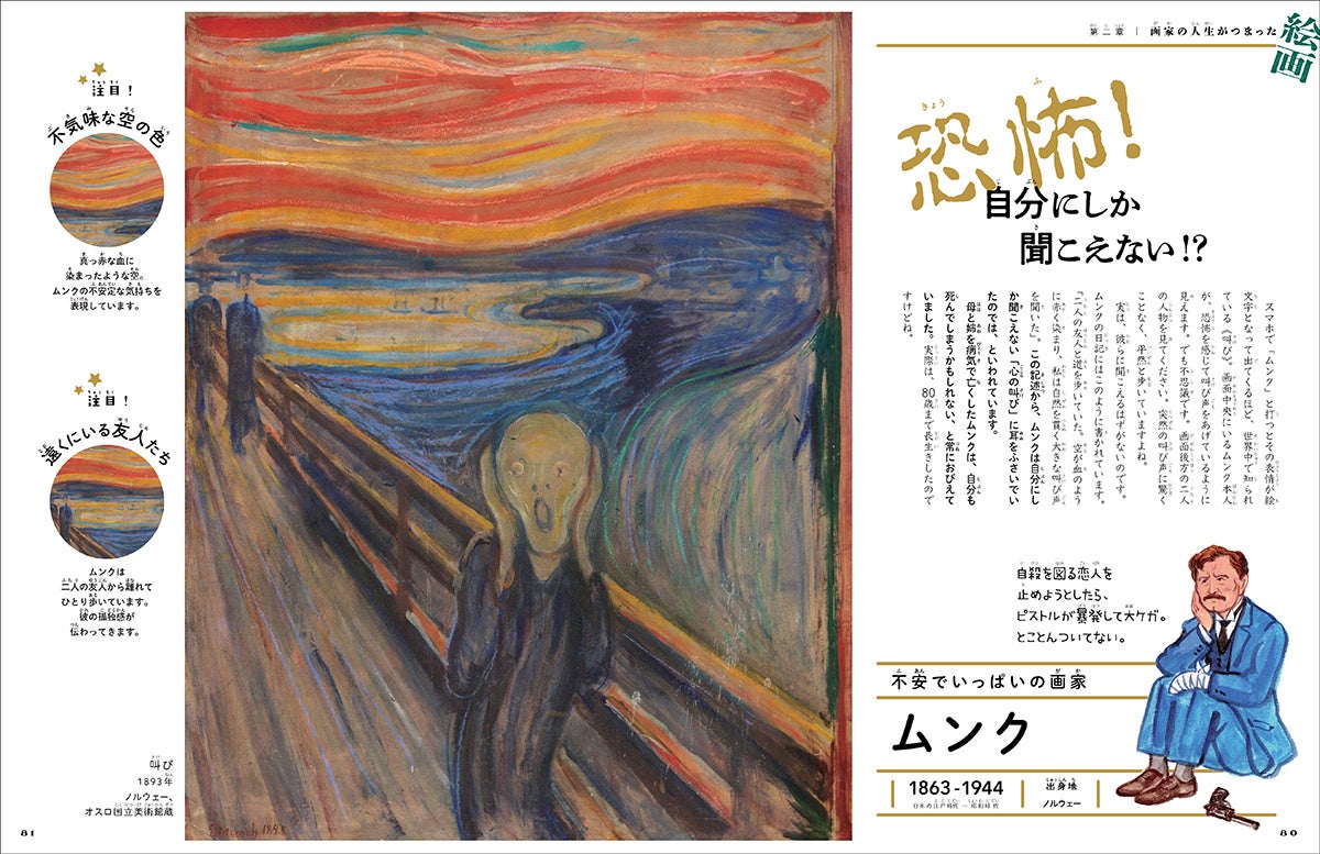 ムンクの《叫び》では、ムンクが絶叫しているように見えますが、その後ろを歩く人々は叫び声に驚く様子はありません。いったいなぜ? このように本書では、名画に隠された謎から、画家の生きざま、名画がたどった数奇な運命まで、名画を楽しむヒントをわかりやすく紹介しています。
