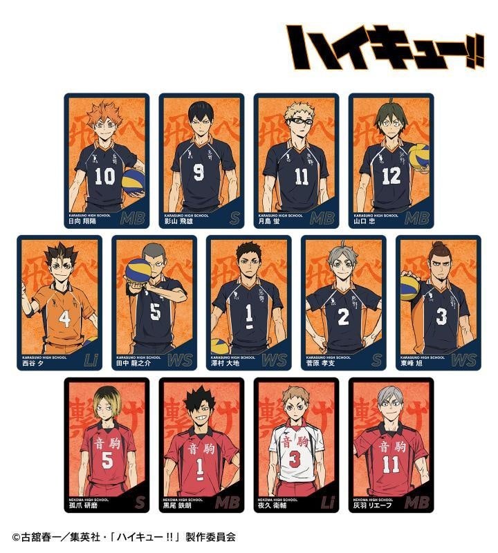 日向翔陽、影山飛雄、月島 蛍、山口 忠、西谷 夕、田中龍之介、澤村大地、菅原孝支、東峰 旭、孤爪研磨、黒尾鉄朗、夜久衛輔、灰羽リエーフのビジュアルをプラスチックカードに仕上げました。