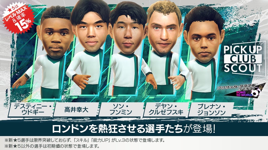 今回の“ピックアップクラブSCOUT”では、「高井幸大」「ソン・フンミン」「デヤン・クルゼフスキ」「デスティニー・ウドギー」「ブレナン・ジョンソン」「ロドリゴ・ベンタンクール」「クリスティアン・ロメロ」「グリエルモ・ヴィカーリオ」「ドミニク・ソランケ」「ジェームズ・マディソン」「ペドロ・ポロ」といった、イングランド強豪クラブのサイドアタックを得意戦術とする新★5選手11人が、「レベルMAX(Lv.50)/覚醒2段階達成/各スキル・各能力UP Lv.3達成」で登場します。