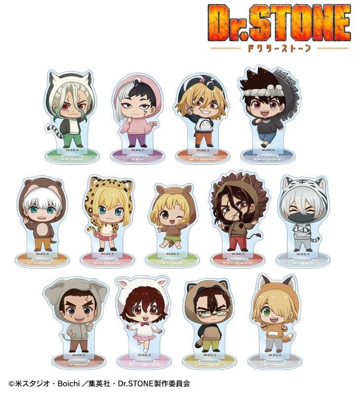 石神千空、あさぎりゲン、七海龍水、クロム、西園寺羽京、コハク、スイカ、獅子王司、氷月、大木大樹、小川杠、金狼、銀狼のちびキャライラストをアクリルスタンドに仕上げました。