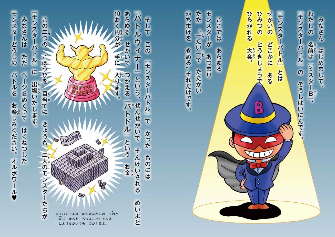 この『モンスターバトル』で勝ったものには、「バトルウィナー」という全世界で尊敬される名誉と、あらゆる世界で使える「バトドル」というお金が手に入ります。