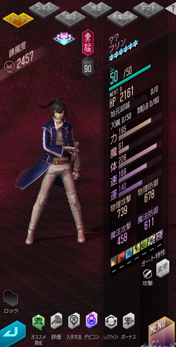 生存効果「敵が単体対象スキル発動時、自身はその攻撃を受け流す。自身以外の味方は、単体攻撃を受けたとき、超反応8「自身のHPを30%回復。(各悪魔バトル中8回)」」「敵全体はいずれかの霊鎖状態のとき、受けるダメージが60%増加、消費MPが2増加。」
