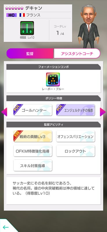 該当の選手を編成すると強くなるフォーメーションコンボ「レ・ボー・ブルー」と戦術得意度Lv10を持つ新★6監督「デキャン」が登場します。