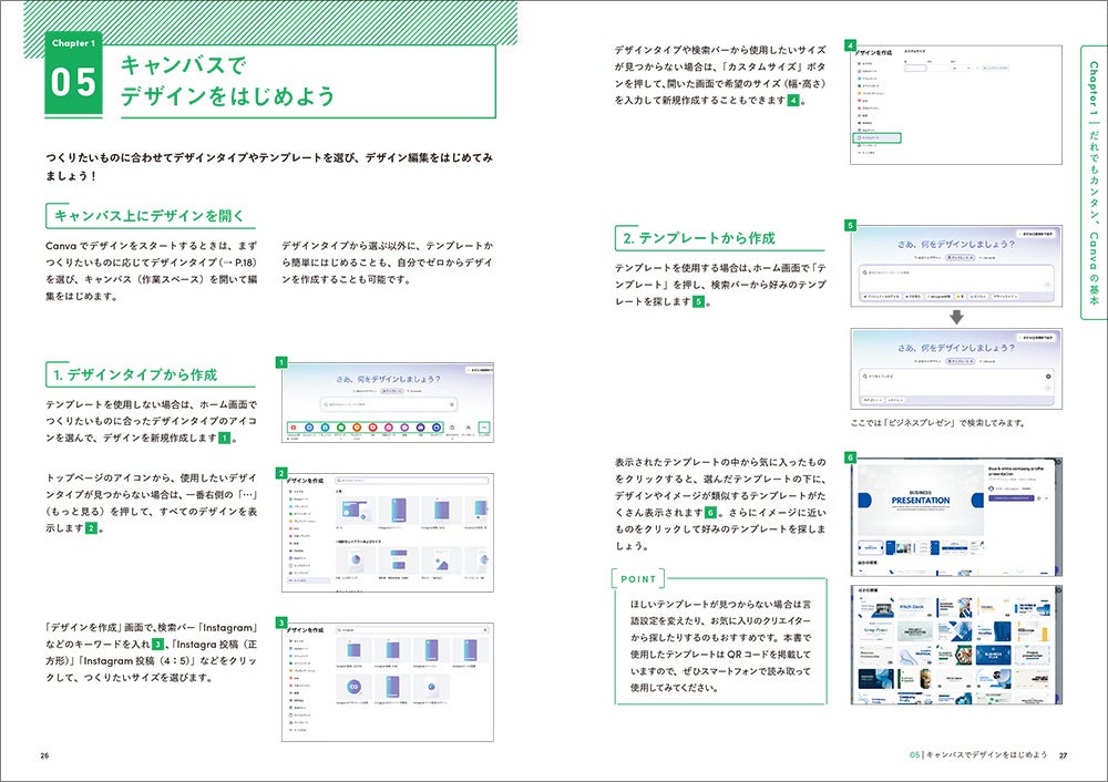 本書の構成は全4章。Chapter1ではCanvaの基本的な使い方を、Chapter2~4ではCanvaの無料テンプレートを活用した作例とその制作手順を紹介しています。ビジネスの現場でお客様の心を動かす資料には、「わかりやすさ」に加えて、「デザインの温度」も大切。ほんの少しの遊び心や自分らしさが欠かせません。