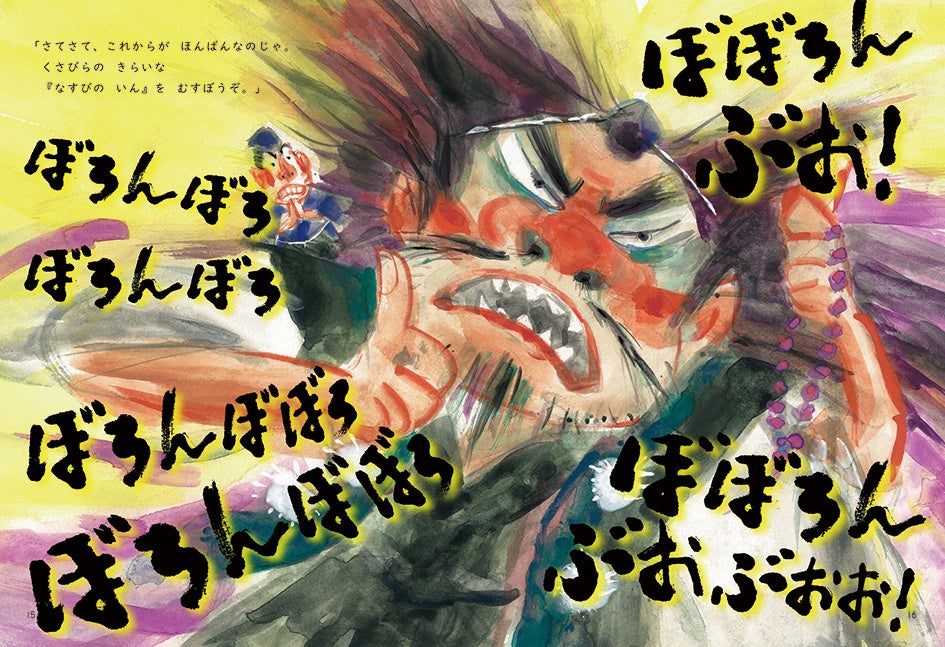 日本の伝統芸能・狂言の演目を、力強いタッチで描いた「くさびら」は、子どもにも分かりやすく、大人も引き込まれます。