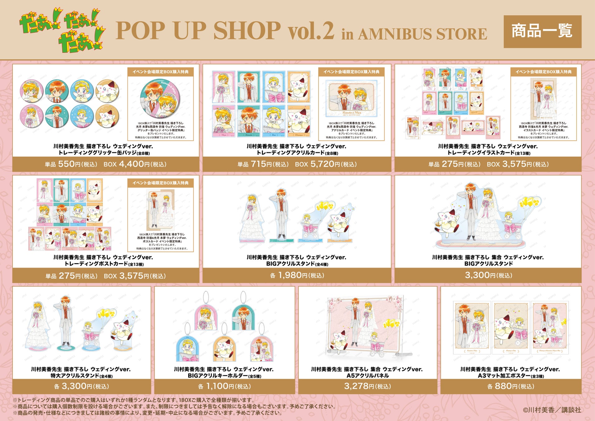 今回のイベントでは、『だぁ!だぁ!だぁ!』より「川村美香」先生による「結婚式」をコンセプトにした新規描き下ろしイラストを使用したグッズを多数先行販売する他、AMNIBUS STORE購入特典の配布を予定しております。