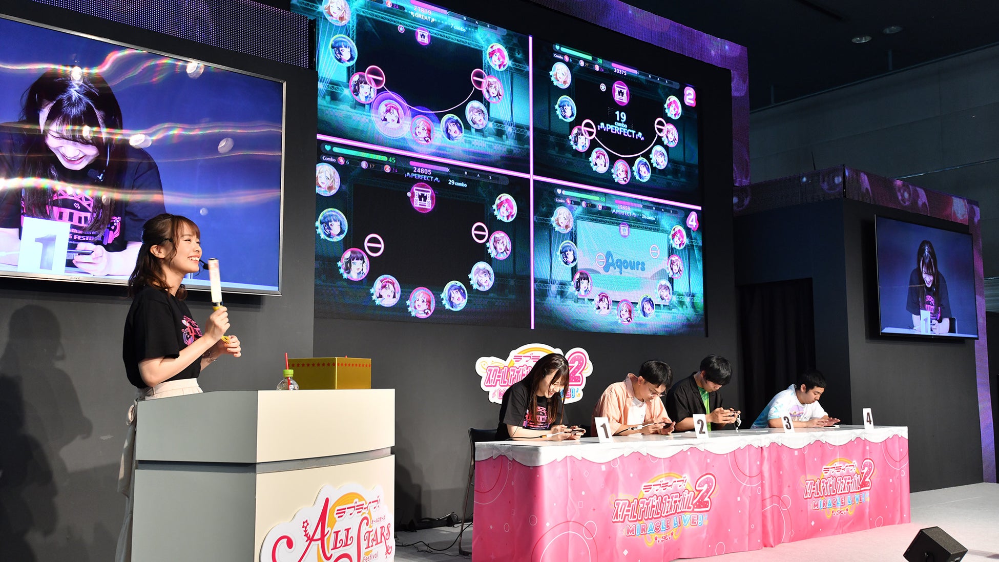 MCの千春さん・美波わかなさん進行のもと、スクフェス2の「きょうりょくプレイ」で各ラウンド4人1組となってスコアを競うスクフェス2ミニ大会を開催いたしました。プレイヤーのみなさんには素晴らしいプレイを披露していただきました。