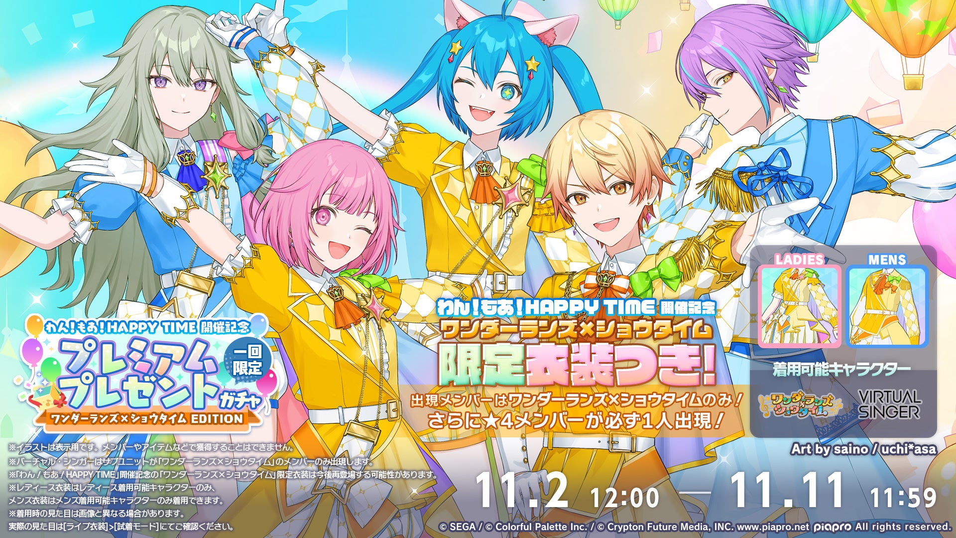 そのほかに、11月2日(日)12時より、「わん!もあ!HAPPY TIME」のキービジュアルに描かれている衣装が獲得できる「プレミアムプレゼントガチャ」を開催いたします。本ガチャでは「MORE MORE JUMP! EDITION」と「ワンダーランズ×ショウタイム EDITION」の2種類が登場し、それぞれのユニットのライブ衣装がセットアイテムとして付いてきます。また、出現メンバーはユニットメンバーのみとなっているほか、★4メンバー1人が確定で獲得できます。
