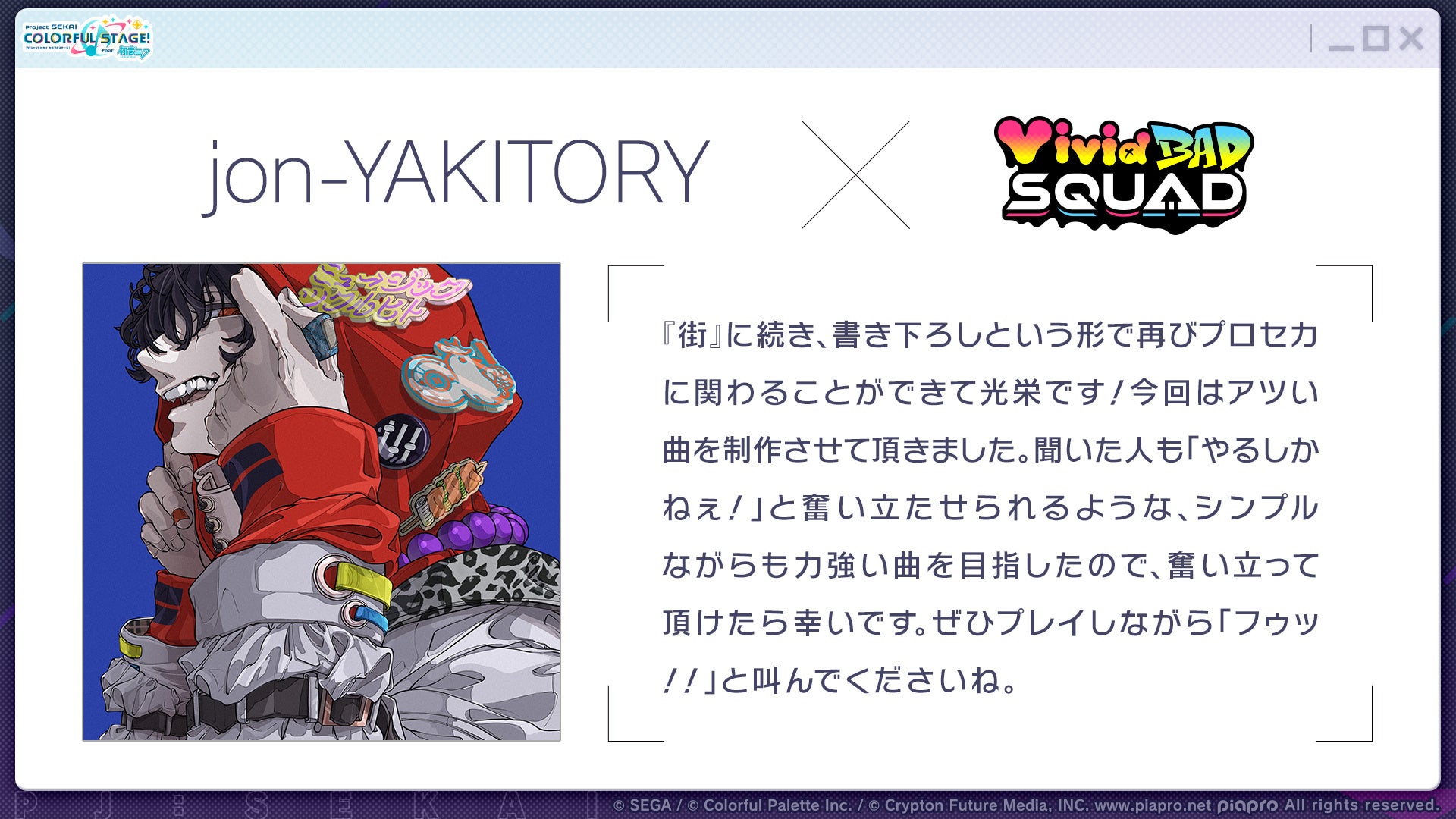蝶々Pさんには「25時、ナイトコードで。」の書き下ろし楽曲、せきこみごはんさんには「ワンダーランズ×ショウタイム」の書き下ろし楽曲、jon-YAKITORYさんには「Vivid BAD SQUAD」の書き下ろし楽曲を提供いただきます。
