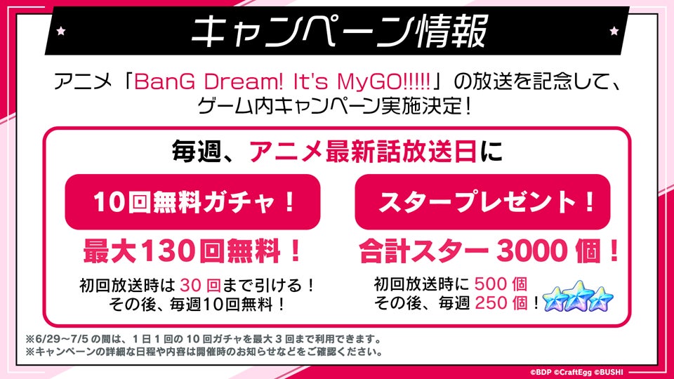 アニメ「BanG Dream! It's MyGO!!!!!」の放送を記念し、スマートフォン向けゲーム「バンドリ! ガールズバンドパーティ!」にてキャンペーンの開催が決定しました。アニメ放送期間中、最大で130回分が無料で引けるガチャや、合計「スター3000個」をプレゼントするログインキャンペーンを実施いたします。
