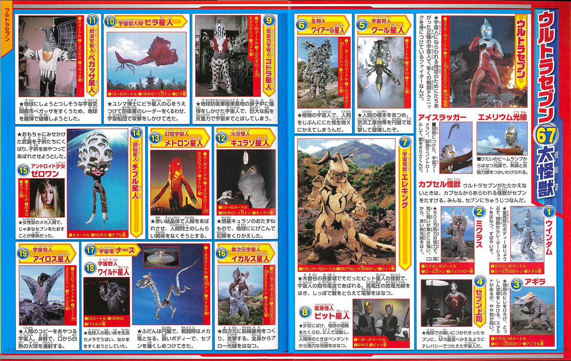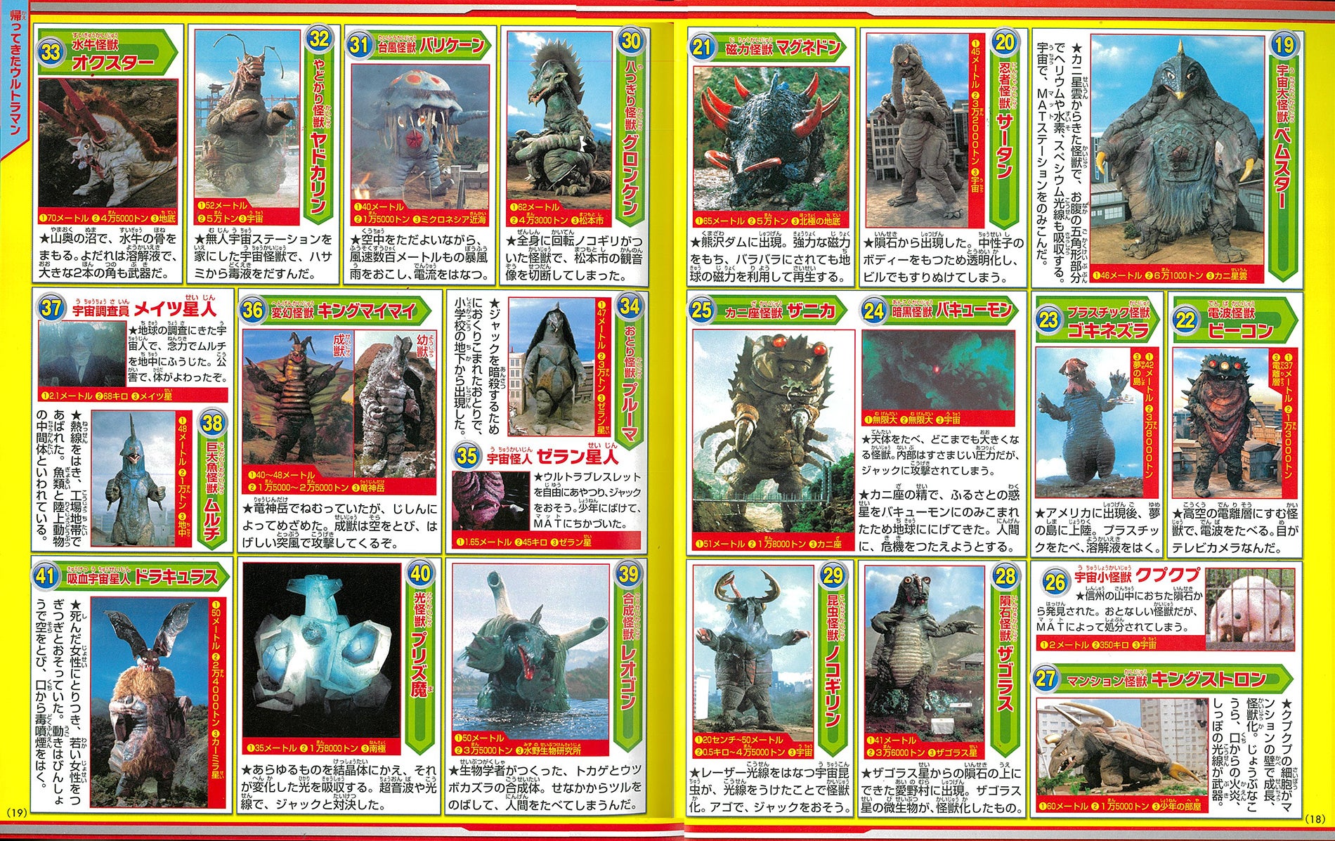 全怪獣・宇宙人の写真はもちろん、身長・体重・出現場所などのデータ、能力や活動などの情報が作品ごと、登場順に載っているので、名前は覚えているのに姿が思い出せないとか、どんな活動をした怪獣だったか忘れた、というときには最適ですし、ただページをめくってさまざまな怪獣の雄姿を眺めるだけでも眼福の気分になれることでしょう。
