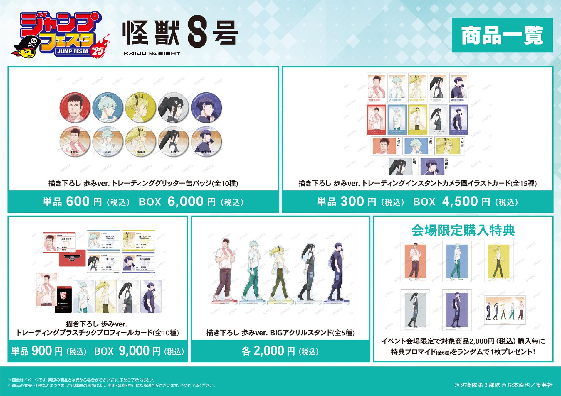 今回のイベントでは、『怪獣8号』より新規描き下ろしイラストを使用したグッズを多数先行販売する他、イベント購入特典の配布を予定しております。
