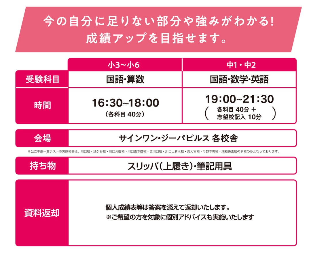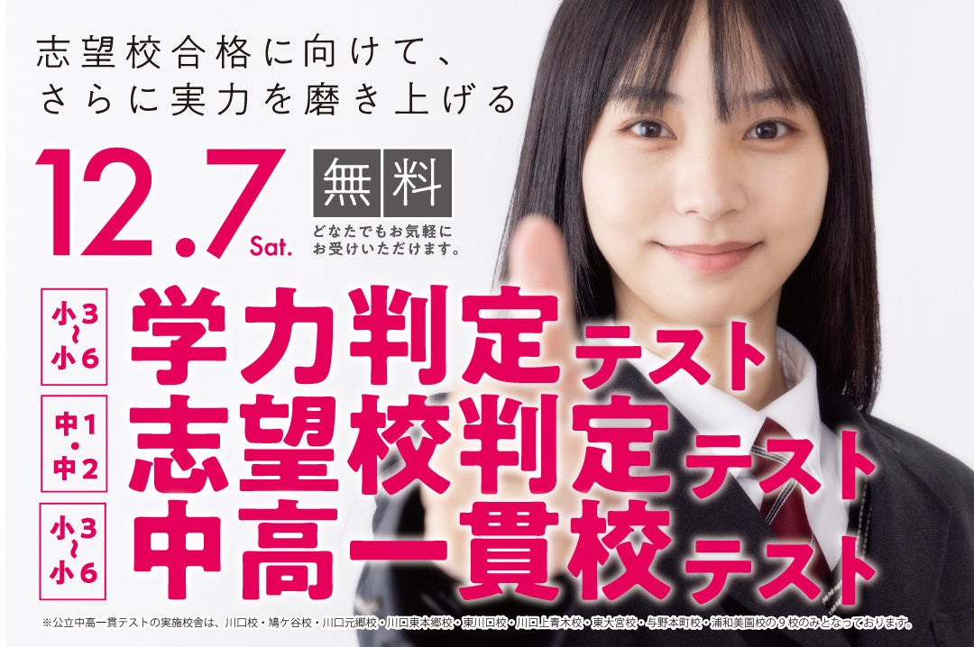 ※中高一貫校テストは、川口校・鳩ケ谷校・川口元郷校・川口東本郷校・東川口校・川口上青木校・東大宮校・与野本町校・浦和美園校の9校舎で実施します。