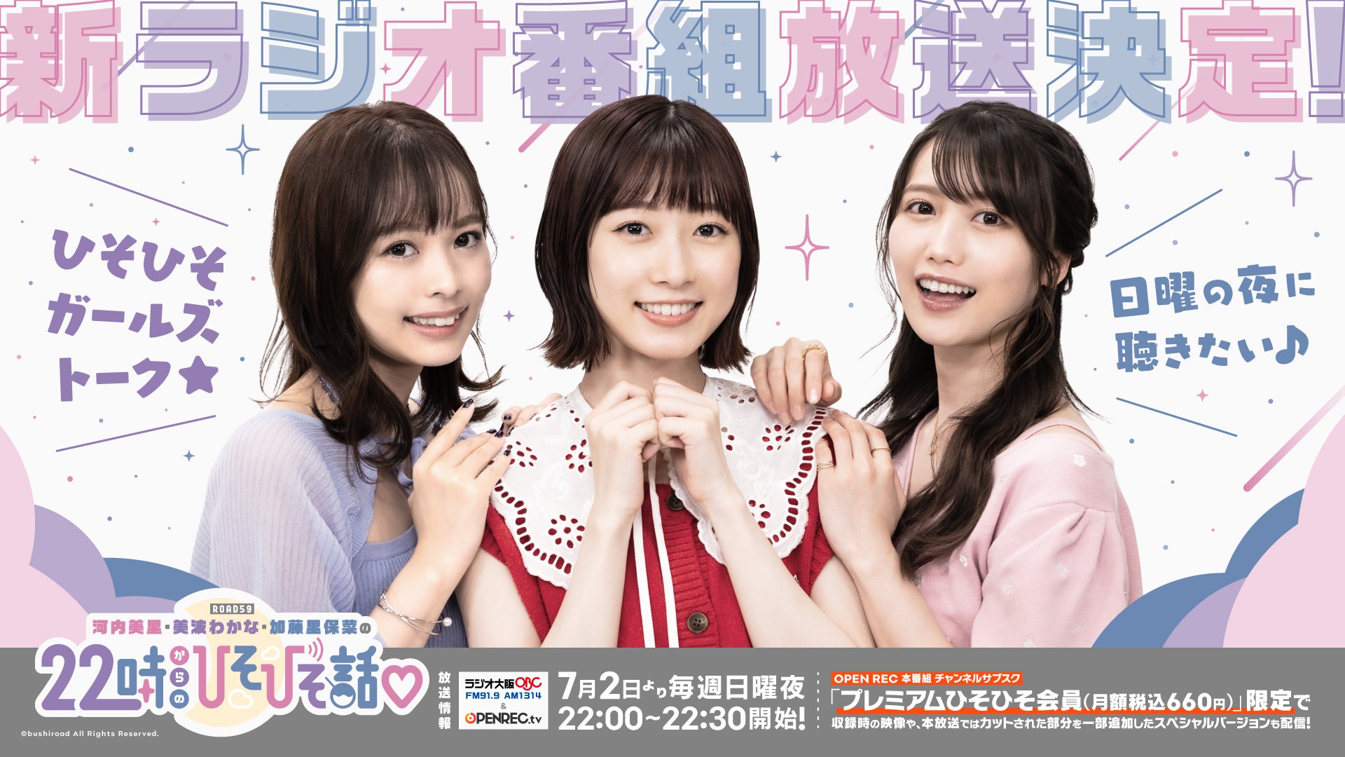 ブシロード、ラジオ大阪、DONUTSの3社共同で制作する新ラジオ番組「ROAD59 河内美里 美波わかな 加藤里保菜 の22時からのひそひそ話♡」が7月2日(日)よりラジオ大阪ほかにて放送開始いたしました。