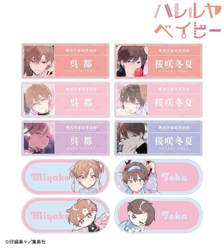 呉 都、桜咲 冬夏のイラスト、キャラクターの名前、学校名をアクリルネームプレートに仕上げました。