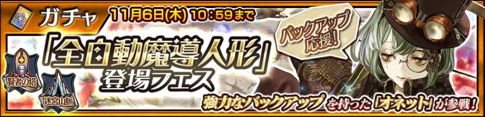 迷宮山脈で造られた機械の身体に、賢者の塔で更なる改良が加えられた「オネット」が登場する“「全自動魔導人形」登場フェス”を実施します。
