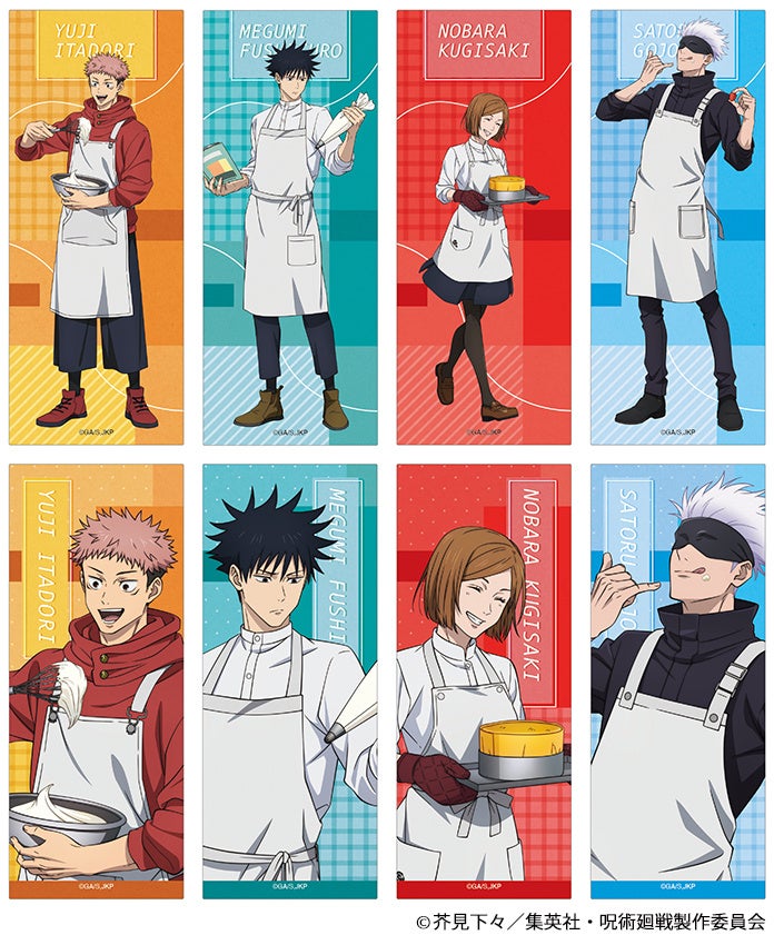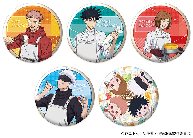 そんな本作より、「アクリルスタンド」や「缶バッジ」など新商品が多数登場! 絵柄は、“調理実習”をテーマにしたエプロン姿の虎杖、伏黒、釘崎、五条の描き下ろしイラストとなっています。