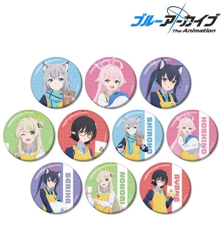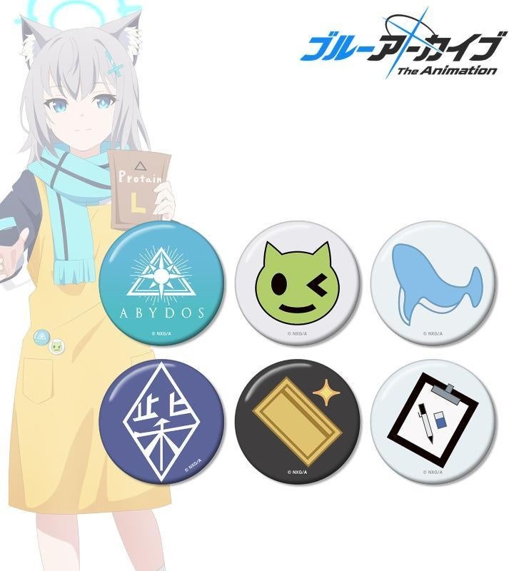 シロコ、ホシノ、セリカ、ノノミ、アヤネの描き下ろしイラストが着用している缶バッジを再現しました。