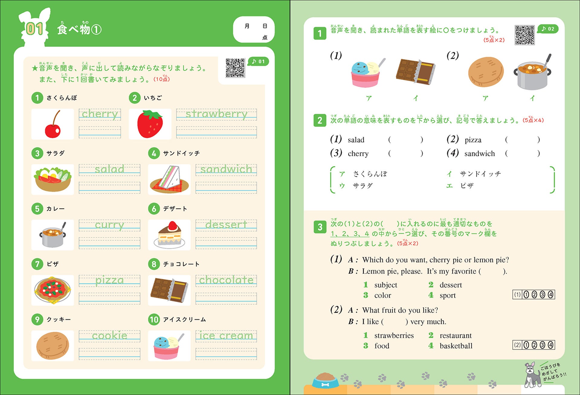 全単語にかわいいイラストとスマホで流せる音声付きで、英検Ⓡでよく出る単語や表現を楽しく身につけられます。さらに、単語をなぞる欄やもう一度書く練習ができる欄があり、五感を使うことで1回の学習でも忘れにくい形式になっています。