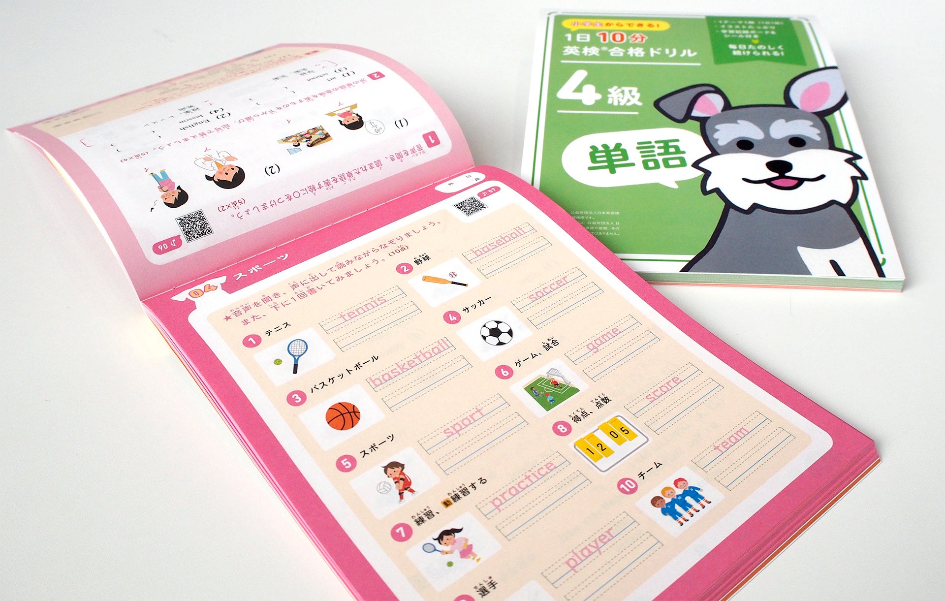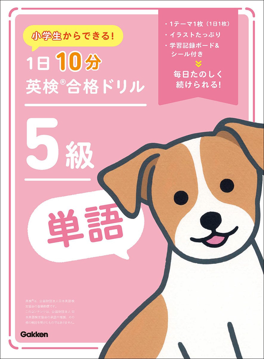 「1日10分でさくっと終わるから、子どもでも飽きずに続けられる!」と大好評の『1日10分英検Ⓡ合格ドリル』シリーズ。小学生のお子さまにとってなじみのある、上にめくるタイプの「天開き型」を採用したこちらのシリーズに、新たに「単語特化版」が加わりました。かわいいイラストがたっぷりついて、英検Ⓡ対策には欠かせない「単語」を、目と耳で感覚的に身につけることができます。「これまでの英検Ⓡ対策本が難しく感じる…」、「問題を解いてみたけど知らない単語が多すぎる…」、とお悩みの小学生にぴったりのドリルです。