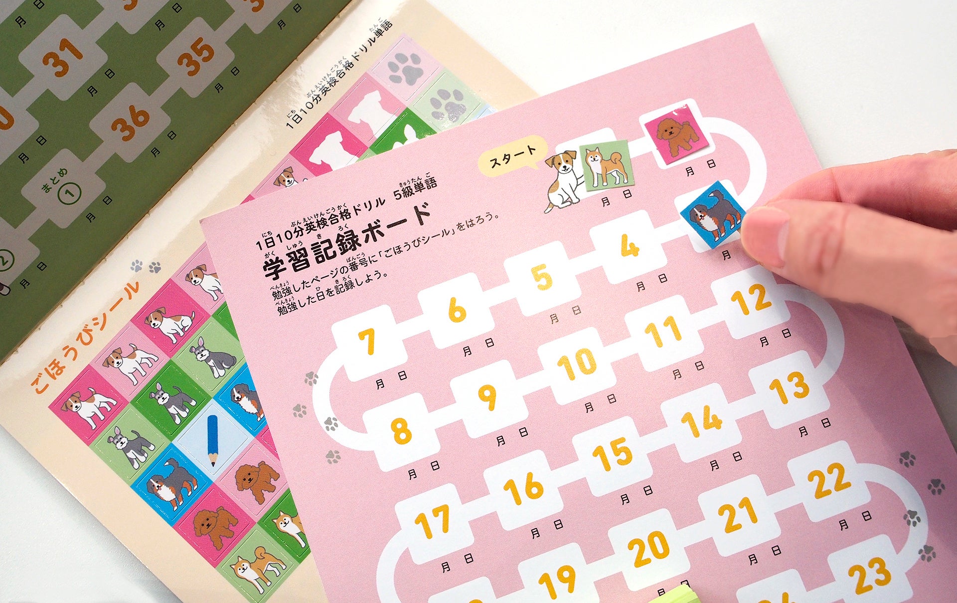 1回の学習が終わるたびに、勉強したページの番号に「ごほうびシール」を貼って、やる気をアップさせましょう! これまでのシリーズに登場したワンちゃんたちも、シールになってみなさんを応援してくれます。
