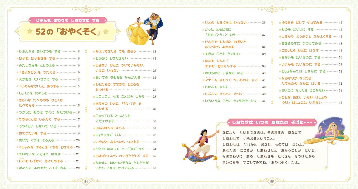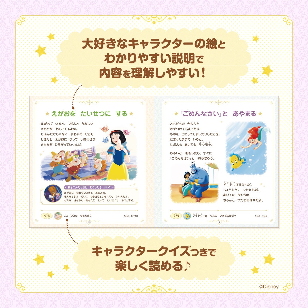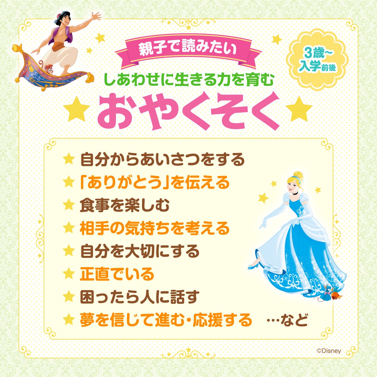 『ディズニープリンセス じぶんもまわりもしあわせにする おやくそくブック』は、ディズニープリンセスの物語から「生活習慣」、「社会ルール・マナー」、「思いやりの心」、「自分を大切にする心の持ち方」など、すてきな大人になるための習慣や考え方を「おやくそく」として紹介する絵本。