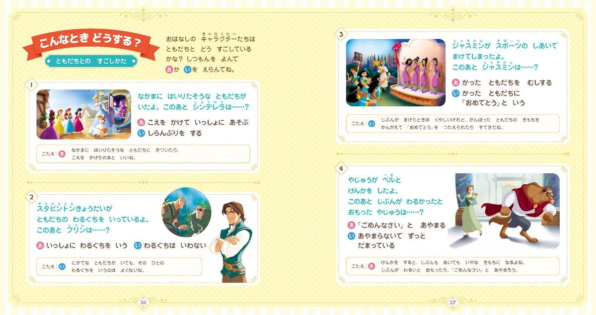 ディズニープリンセスや王子などのキャラクターがこの場面の後どうしたかを当てて、ルールやマナー、友だちとの過ごしかたなどを知ることができる2択クイズページもあります。