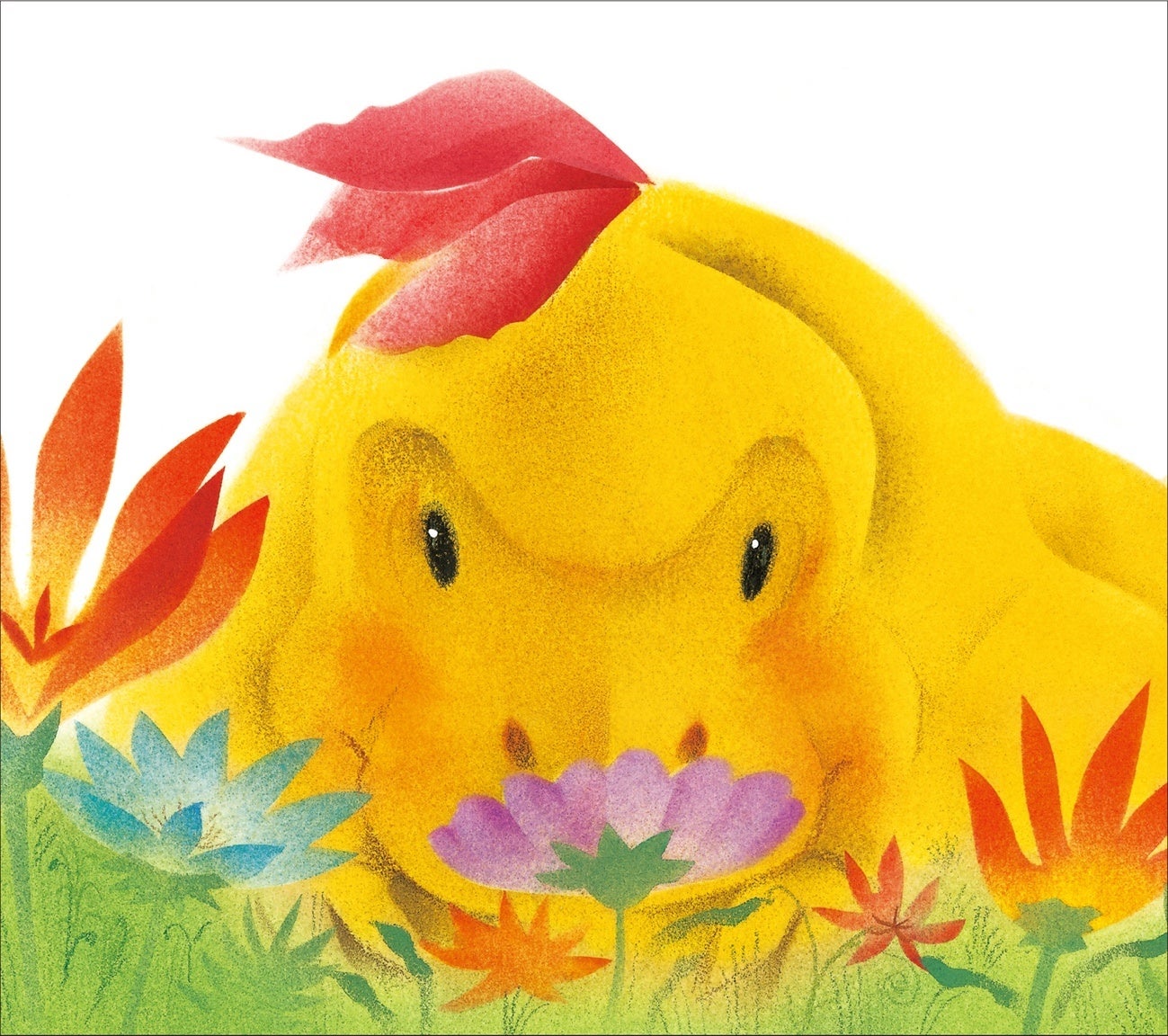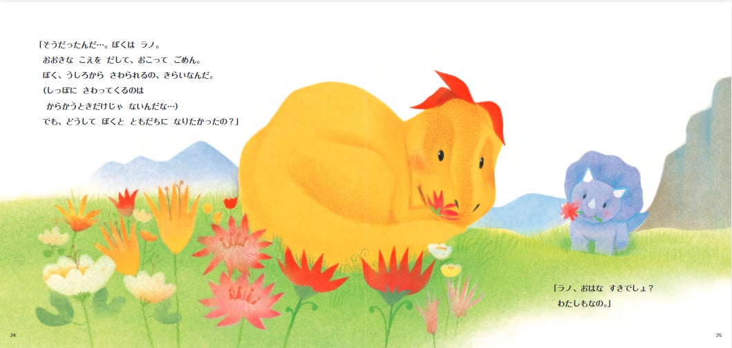 ティラノサウルスといえば、恐竜の中でも群を抜いて恐ろしい肉食の恐竜として有名です。そんなティラノサウルスの男の子が主人公というと、強くて少し乱暴な子どもを想像しますが…。実はイメージに反して、このお話の主人公のラノはお花が大好き。いつもお花のにおいをかいでいます。