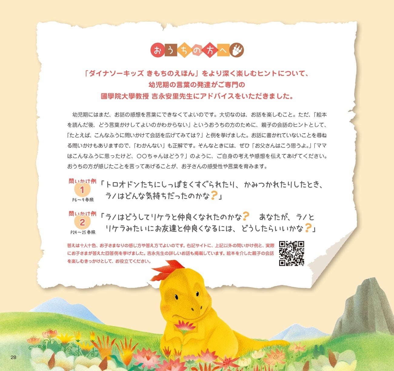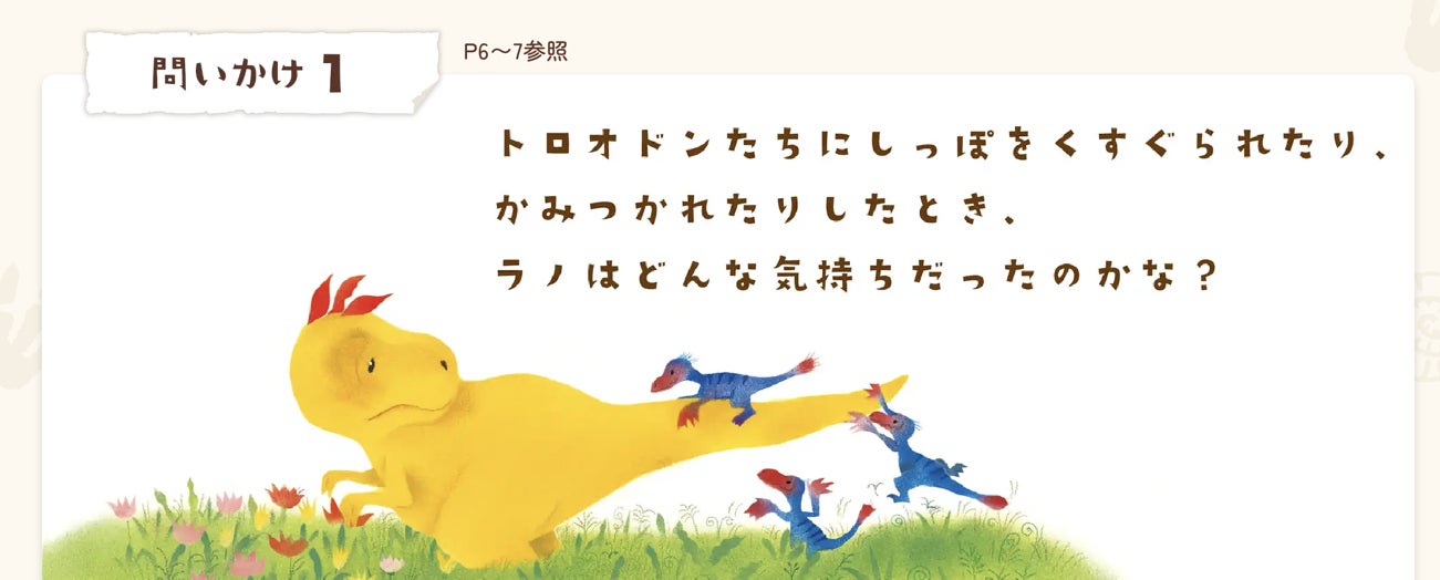 その一つが、各巻の巻末にある企画ページの「おうちの方へ」です。そこでは、幼児期の言葉の発達が専門の國學院大學・吉永安里(よしながあさと)教授の監修のもと、読後に絵本の理解を深めるための「問いかけ例」を掲載しています。また、「ダイナソーキッズ」公式サイトで、絵本に未掲載の「問いかけ例」と併せて、読者の皆さまから寄せられたお子さまたちのリアルな声を拾った「回答例」を挙げています。