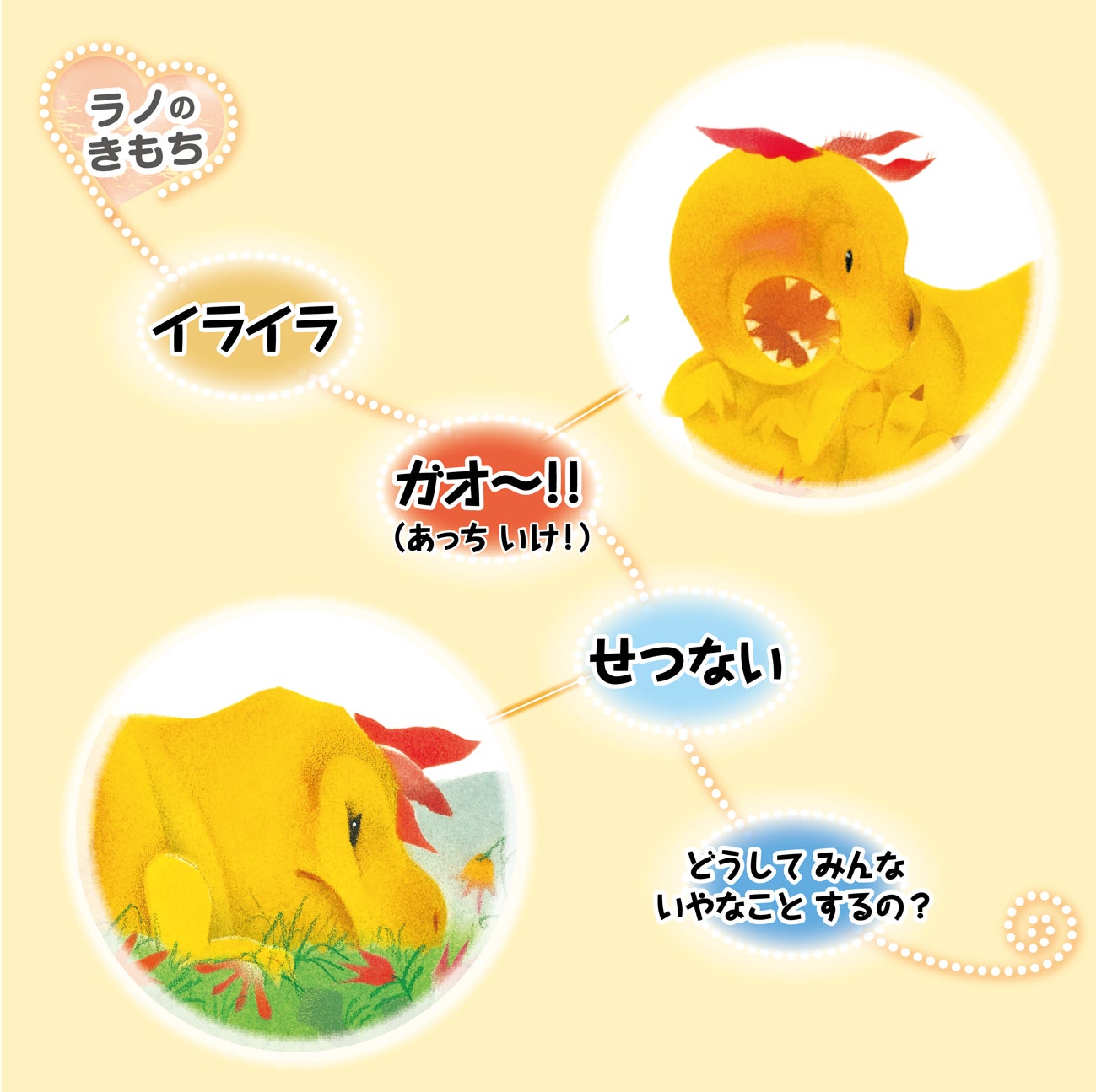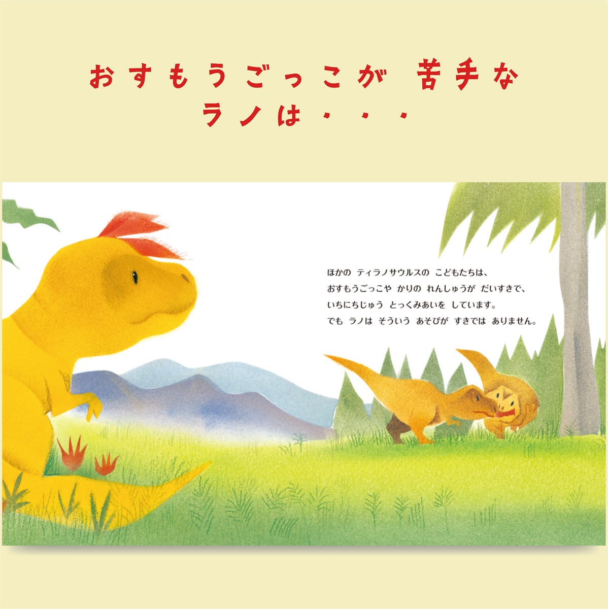 既刊の『まいごになってさみしいパフ』と『ゆうきをだしてプテラ』に続く11月発売の最新作は、一番人気の恐竜、ティラノサウルスの子どもラノが主人公です。