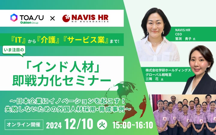株式会社 学研ホールディングス(東京・品川/代表取締役社長:宮原博昭)のグループ会社、株式会社TOASU(東京・品川/代表取締役社長:宮田 晃)は、2024年12月10日(火)に、「『IT』から『介護』『サービス業』まで! いま注目の「インド人材」即戦力化セミナー~日本企業にイノベーションを起こす! 失敗しないための外国人材採用・育成事例~」を実施いたします。