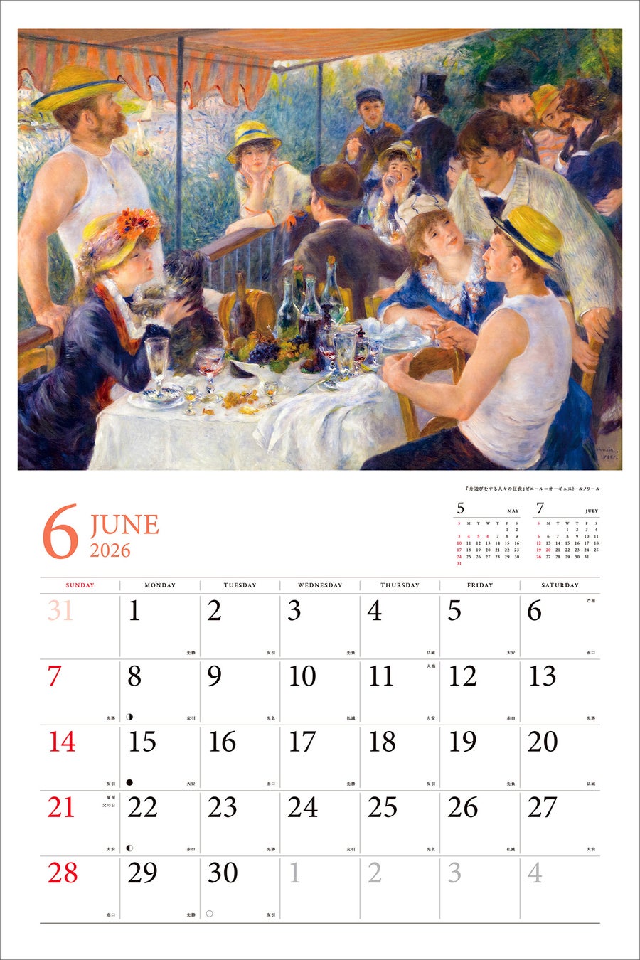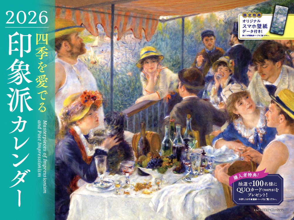 印象派・ポスト印象派の画家たちが描いた、四季を楽しむ人々や自然をモチーフにした絵画を集めたカレンダーです。大人気のモネ、ルノワール、セザンヌ、ゴッホをはじめ、穏やかな風景画を描いたシスレー、アメリカ印象派のハッサムなど、幅広く選出しています(ルノワール『舟遊びをする人々の昼食』、モネ『睡蓮』、ゴッホ『種まく人』などを収録)。一年を通じて、心が落ち着く絵画の世界を楽しめます。